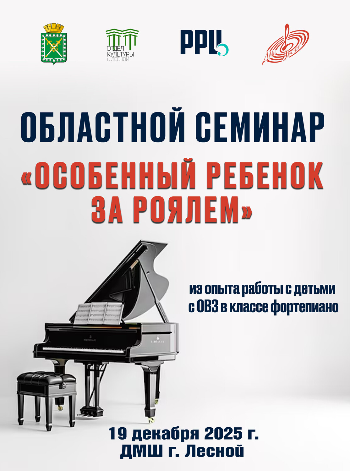 19 декабря в ДМШ города Лесного 80 специалистов образовательных учреждений Нижнего Тагила, Верхней Салды, Нижней Туры, Кушвы, ЗАТО Свободный, Лесного, представляющие школы дополнительного образования, дошкольные учреждения, средние общеобразовательные и коррекционные учреждения, съехались на уникальный Областной семинар «Особенный ребенок за роялем» по плану Регионального ресурсного центра в сфере культуры и художественного образования Свердловской области.