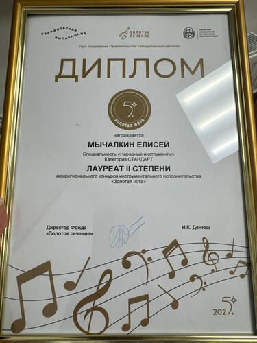 Поздравляем Елисея Мычалкина (преп. Макарова С.В.) со званием Лауреата II степени в престижном V Межрегиональном конкурсе инструментального исполнительства «Золотая нота» на базе Загородного образовательного центра «Таватуй» г. Екатеринбург. Организатором конкурса является Фонд «Золотое сечение» совместно с Уральской специальной музыкальной школой (колледж) при поддержке Правительства Свердловской области и Свердловской государственной академической филармонии. | |